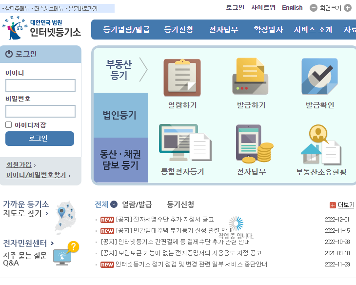 기본적으로 등기부 열람을 위해서는 인터넷등기소 회원이어야 열람이 가능합니다. 아이디와 비밀번호를 입력하는 화면 아래에 있는 회원가입을 통해서 회원이 되신 후, 로그인을 진행해줍니다.