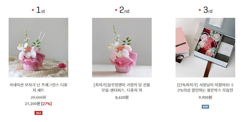 블루밍앤미 카네이션 가격은 크게 3가지 가격대로 구성되어 있습니다. 1만원 이하 카네이션은 8,620원, 9,900원이며 1만원 이상의 디퓨저 기능도 있는 카네이션은 21,200원으로 구성되어 있는데, 여기서 추가 옵션으로 용돈박스나 카네이션의 색깔을 바꿔서 구매하실 수도 있습니다.